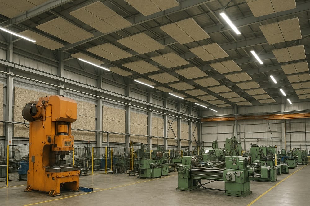 - Ses Yalıtımlı Duvar Panelleri Kullanılmalıdır: Fabrikanın dış cephe duvarlarına veya iç duvarlarına ses izolasyon panelleri monte edilmelidir.